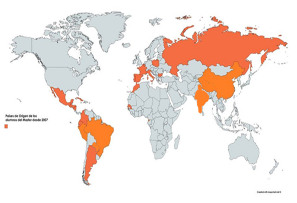Gracias a la labor del Secretariado de Relaciones Internacionales, el Máster ha sido cursado por estudiantes de más de 20 nacionalidades y de cuatro continentes desde 2007. El Máster ha contado con alumnos/as de Portugal, Francia, Bélgica, Italia, Polonia, Rusia, Bulgaria, Marruecos, Senegal, Guinea Ecuatorial, China, España, Argentina, Ecuador, Colombia, Honduras, Guatemala, Nicaragua, México, Cuba, El Salvador, India y Paraguay. Estos estudiantes acceden al Máster o bien a través del sistema de acceso UEx, o a través de programas como Erasmus Mundus, Alianza del Pacífico, AUIP, Learn Africa, o Fundación Carolina, entre otros.